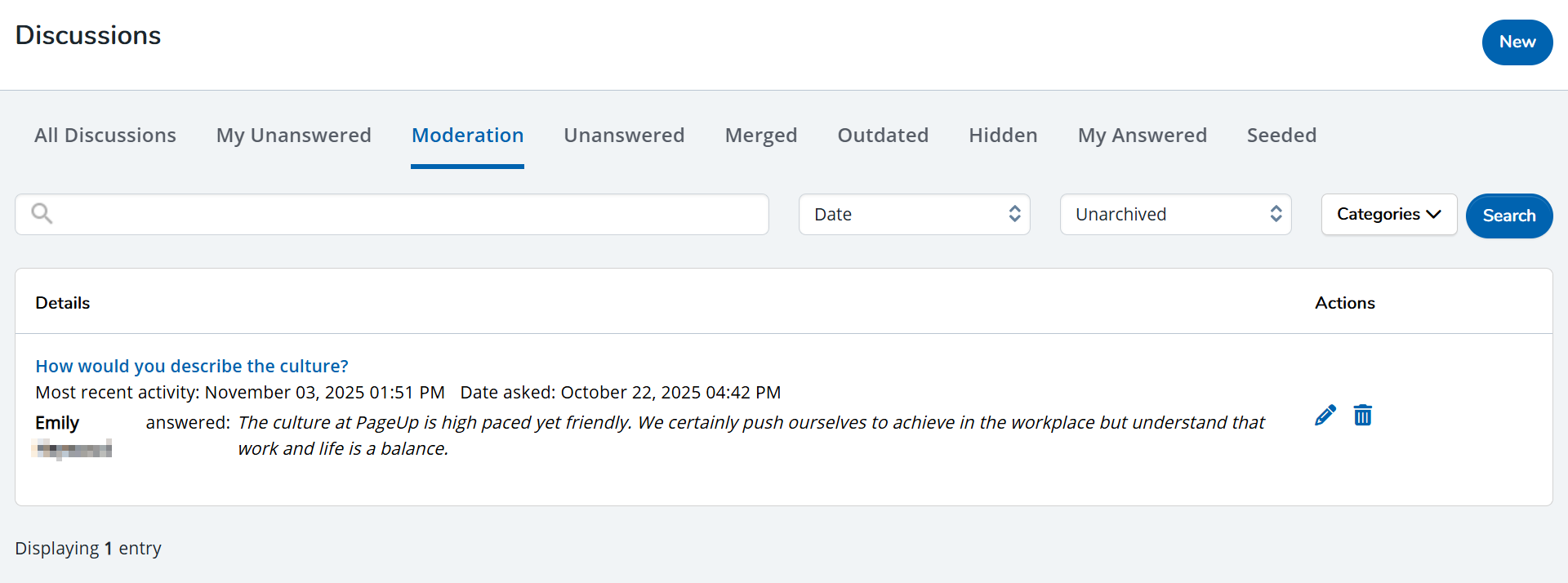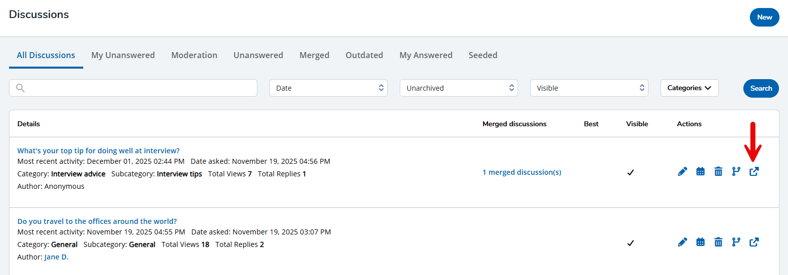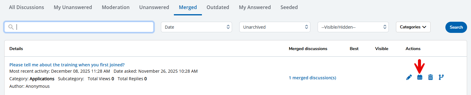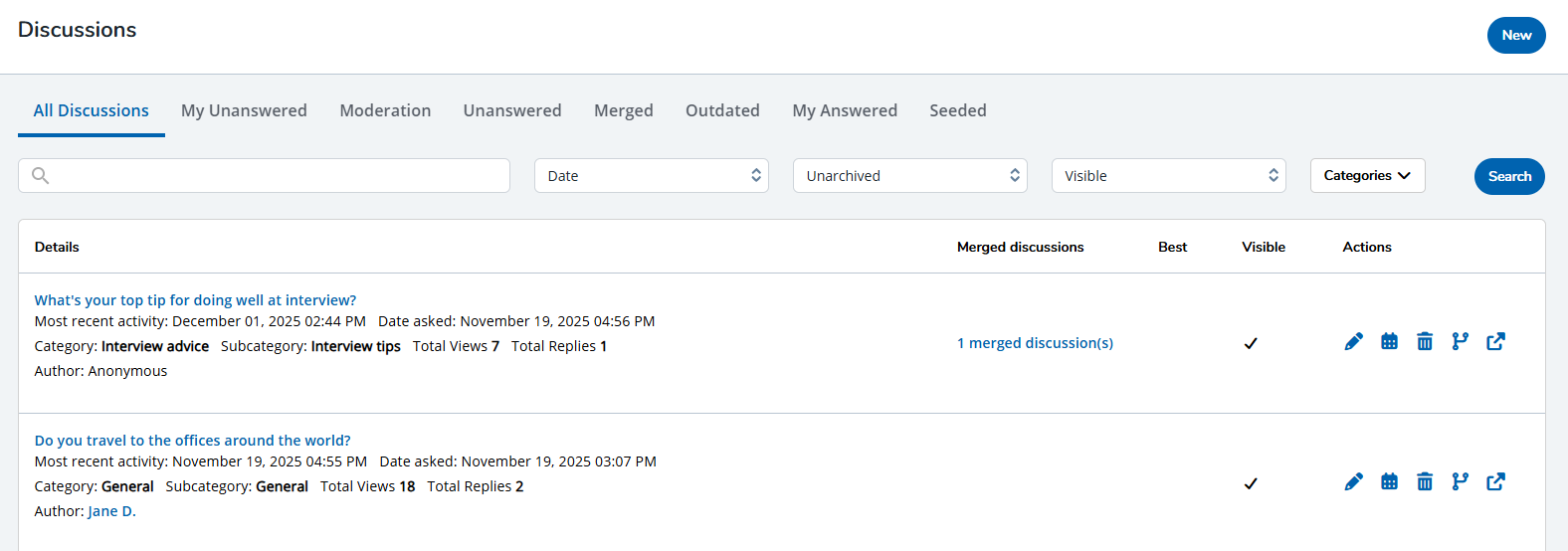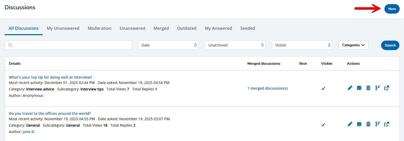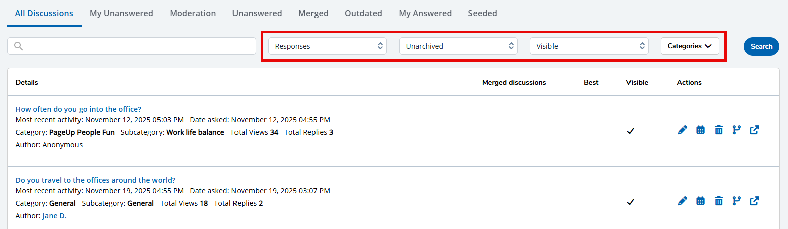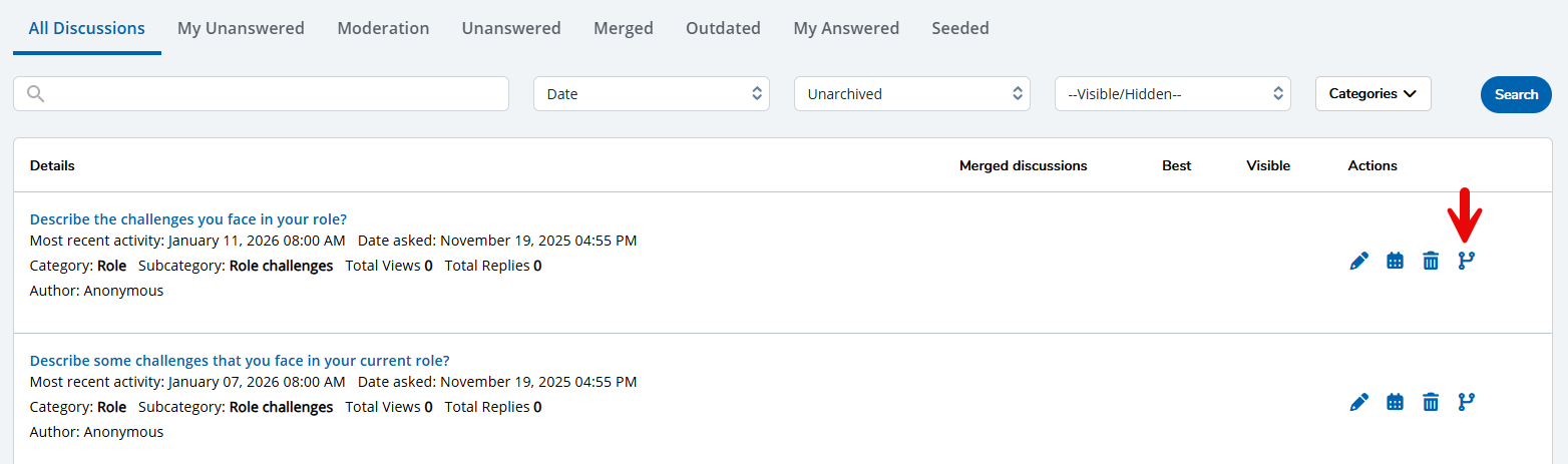 - All Discussions: View and manage all Discussions here. Each item contains actions that enable you to edit an existing discussion, update an outdated discussion, delete a discussion if it's no longer needed, merge a discussion, and view a discussion on your public site.