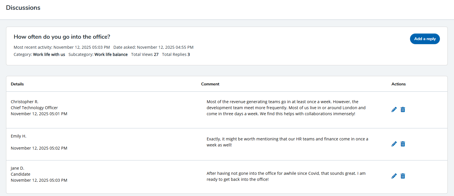 Delete or edit reply: An admin has the capability of removing a reply from a discussion by selecting the Delete (trash) icon. Clicking this will immediately remove the comment from the public-facing platform. Additionally, selecting the Edit (pen) icon allows admins access to the Update a reply page.