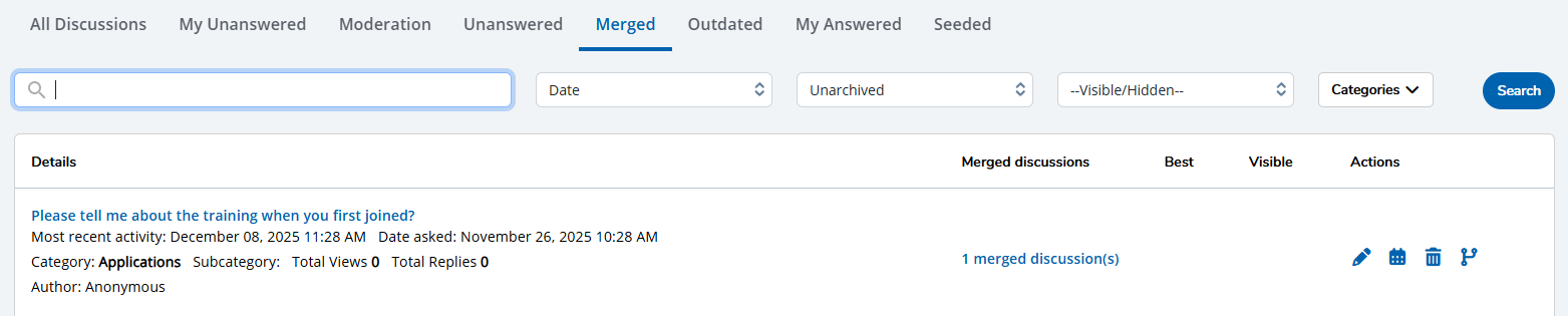 Once the merge is completed, the duplicate will be removed from the All Discussions tab. By selecting the Merged tab, you can view any recent or past discussions that have been merged together, as well as see the merged discussions by clicking the hyperlink under the Merged discussions column to the right of the discussion.