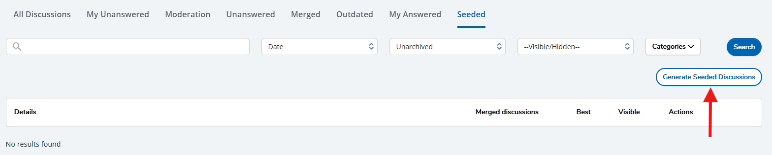 - Seeded: View and manage Seeded Discussions, ensuring a constant flow of questions to be answered by employee ambassadors. See below for more details.