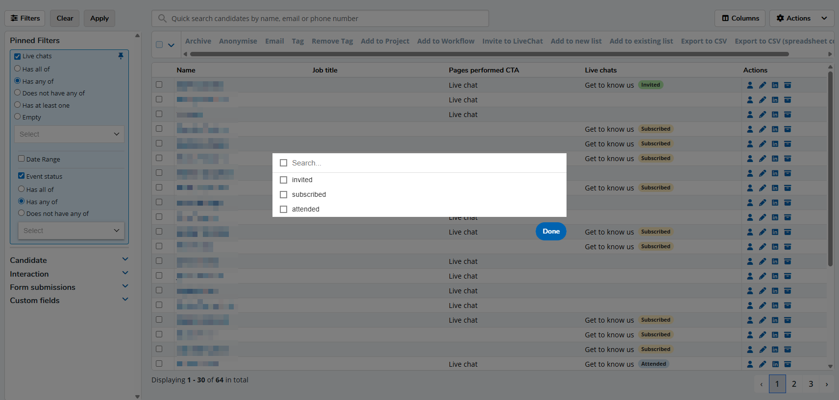 On the Candidate Grid, you can filter to see which candidates were Invited, Subscribed, or Attended your Live Chat Event.