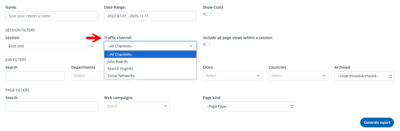 When generating your report for Top Sources, you can filter by the Traffic channel. The options to select from are: