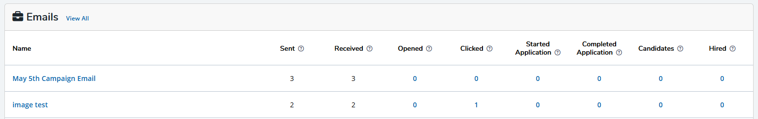 The same information is also available for your jobs, videos, and blogs. Email data appears slightly differently, to reflect the different means of candidate interaction: