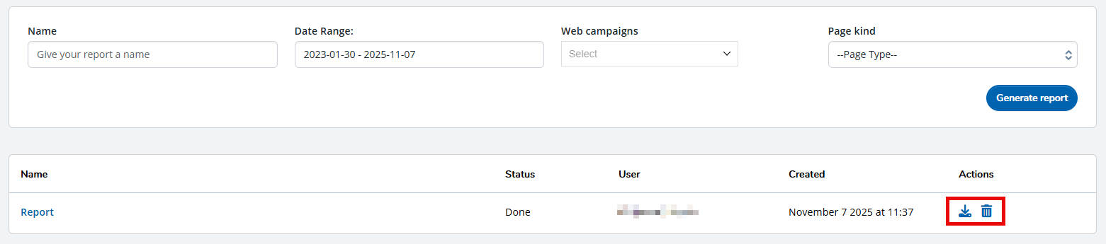 A report will be generated and displayed on the page. You can download it as a CSV file or delete it if you no longer need it.