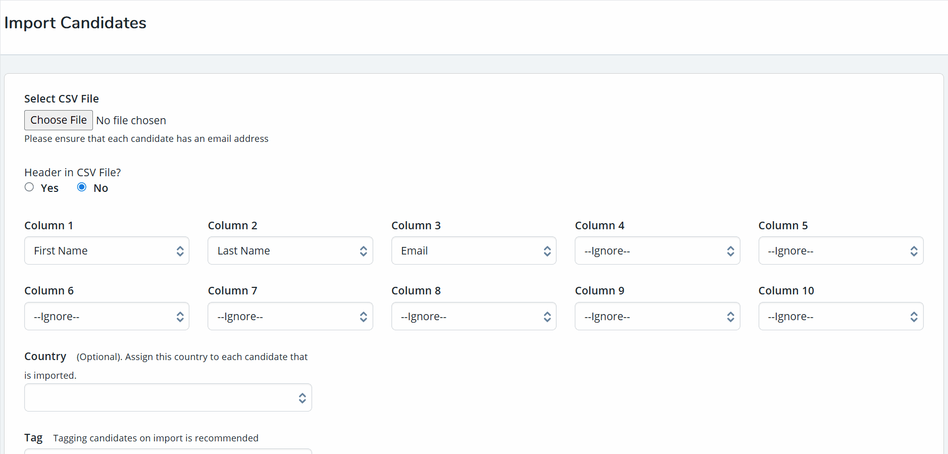- From the Country drop-down, select a country if one is required to assign to each candidate.