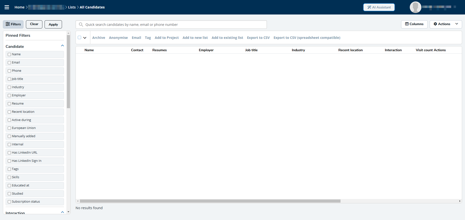| Quick search bar (text field) | Search for candidates quickly by their name, email or phone number. See Simple candidate search for more information. |