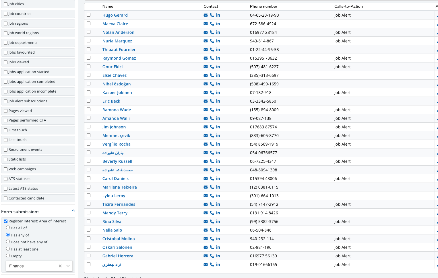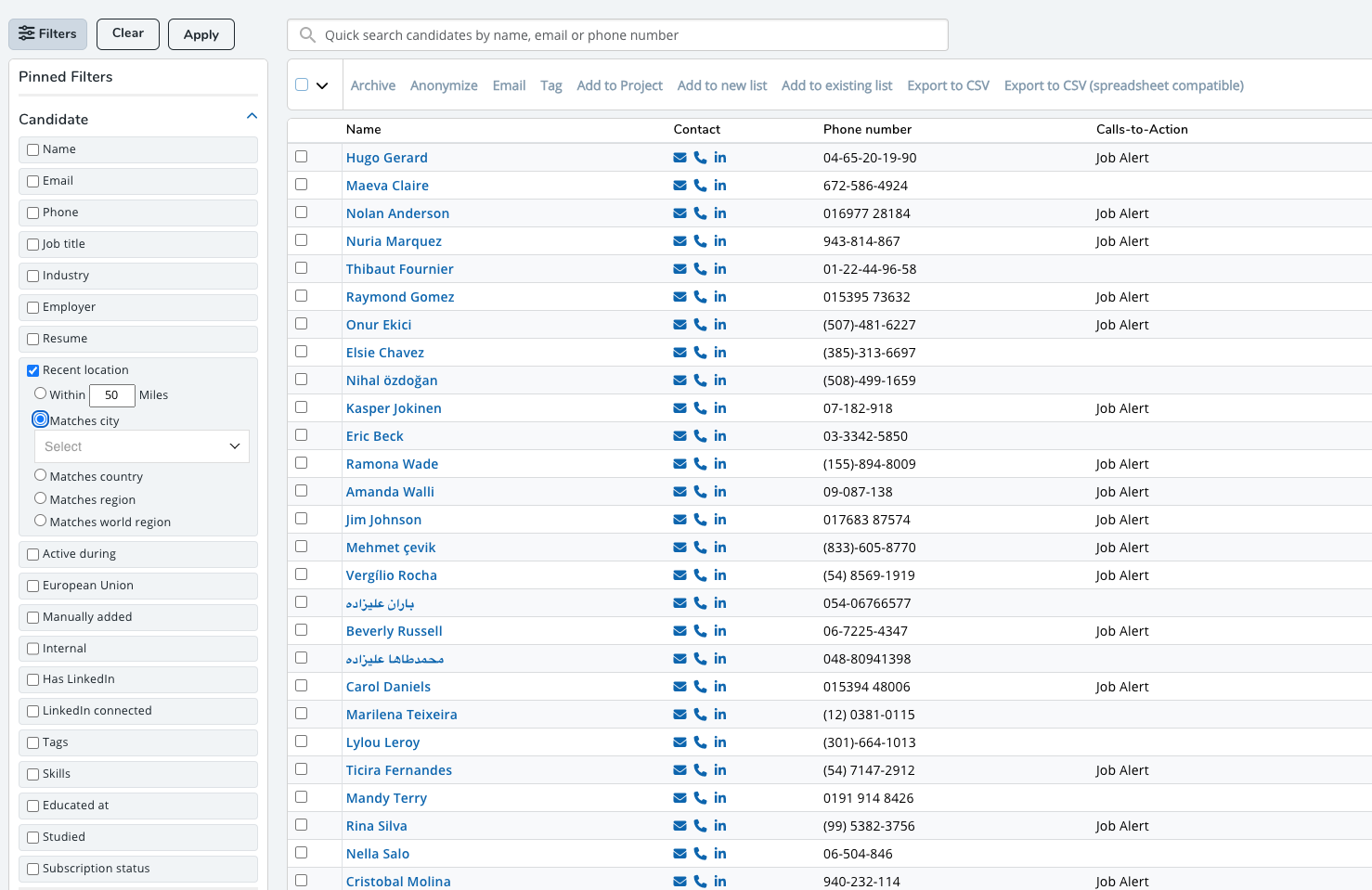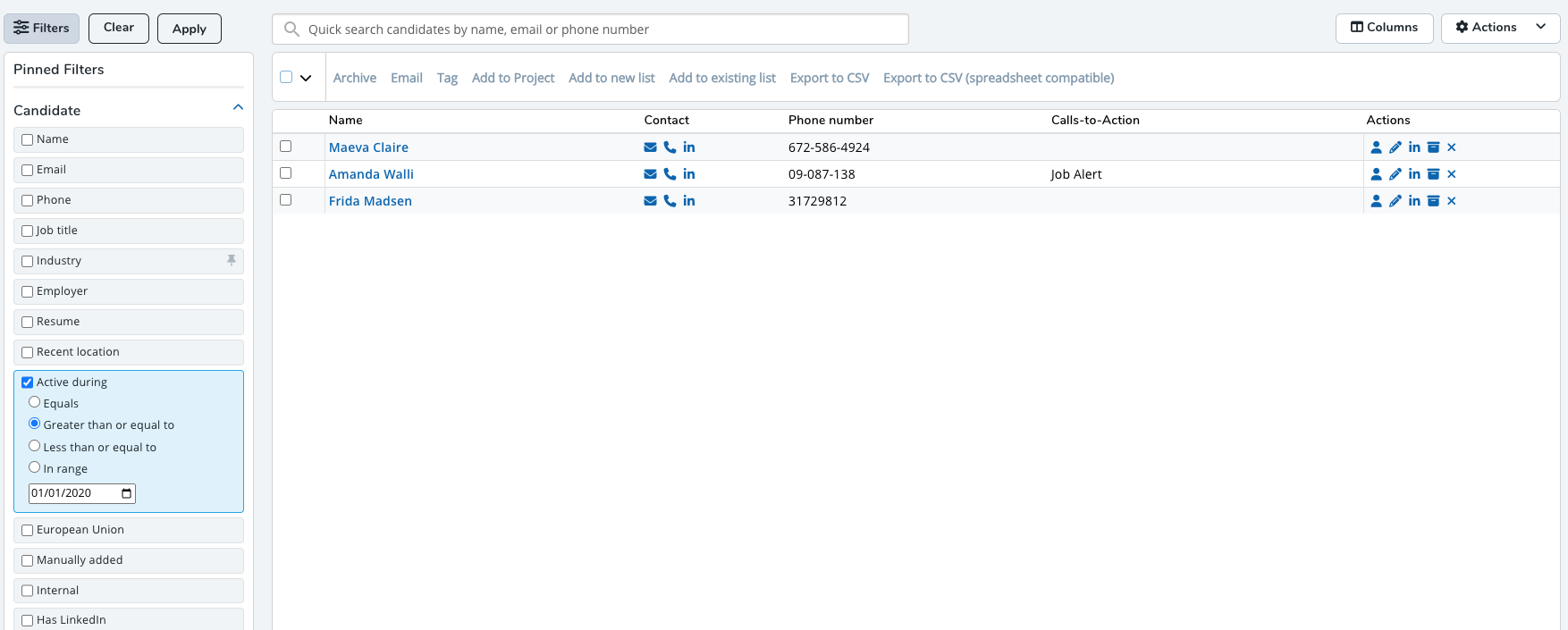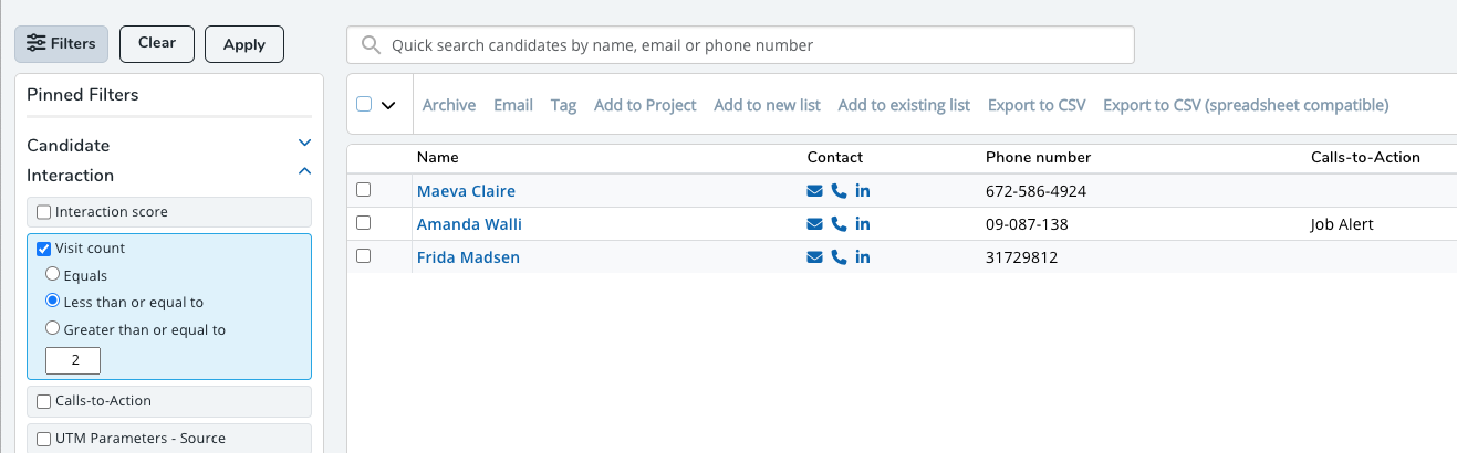 - The candidates that meet the criteria of that list will be shown, and the filters will be populated. See Filtering below for further details.