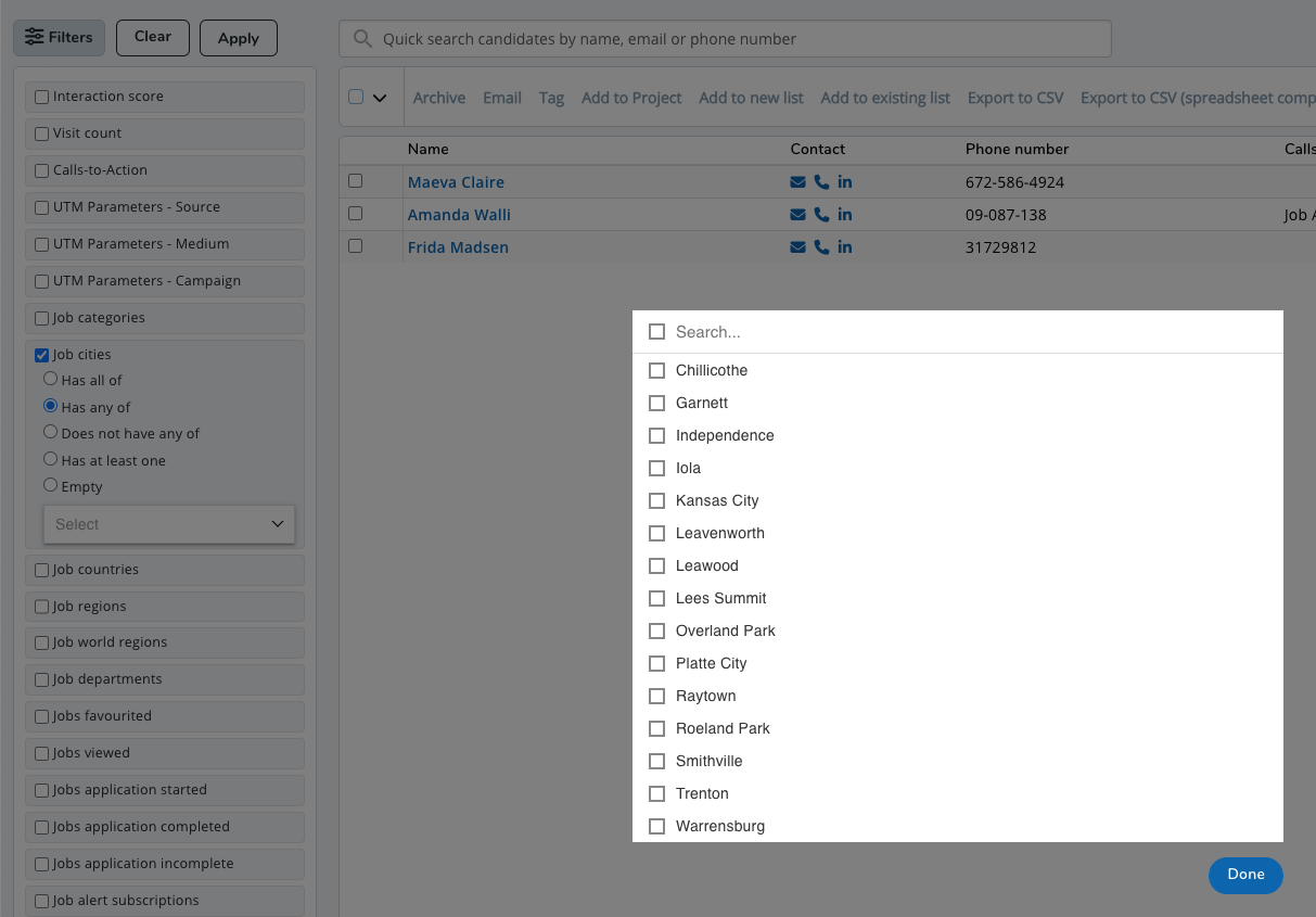 - Has any of: The candidate has any of the tags that have been selected in the filter.