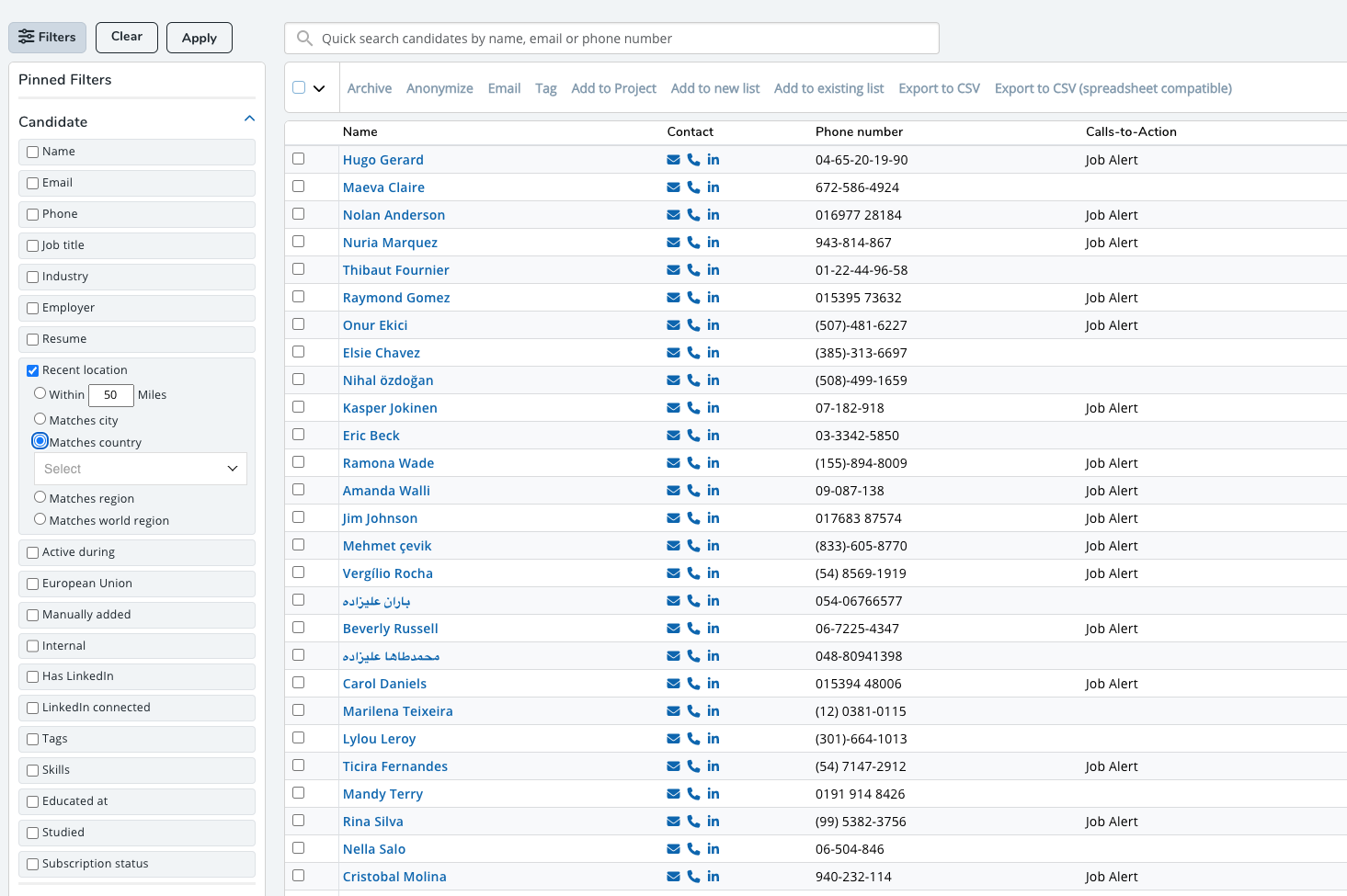 - From the left side, click the Filters button. Filter the candidates by using the filters and clicking Apply. See Filtering below for further details.