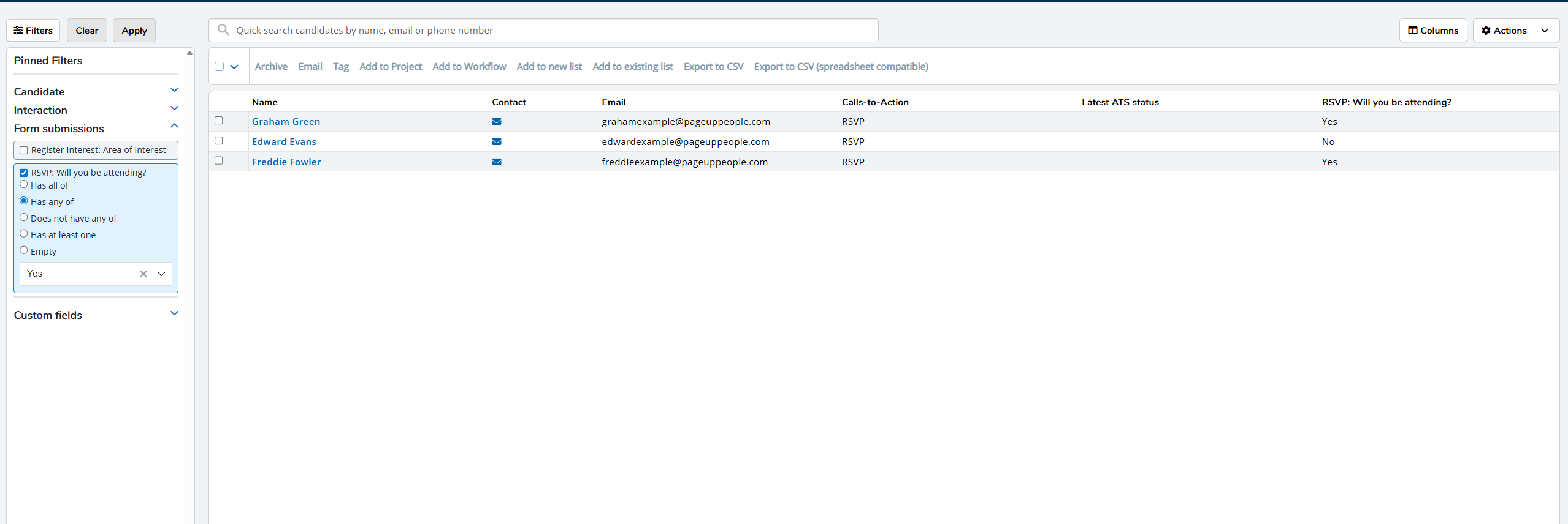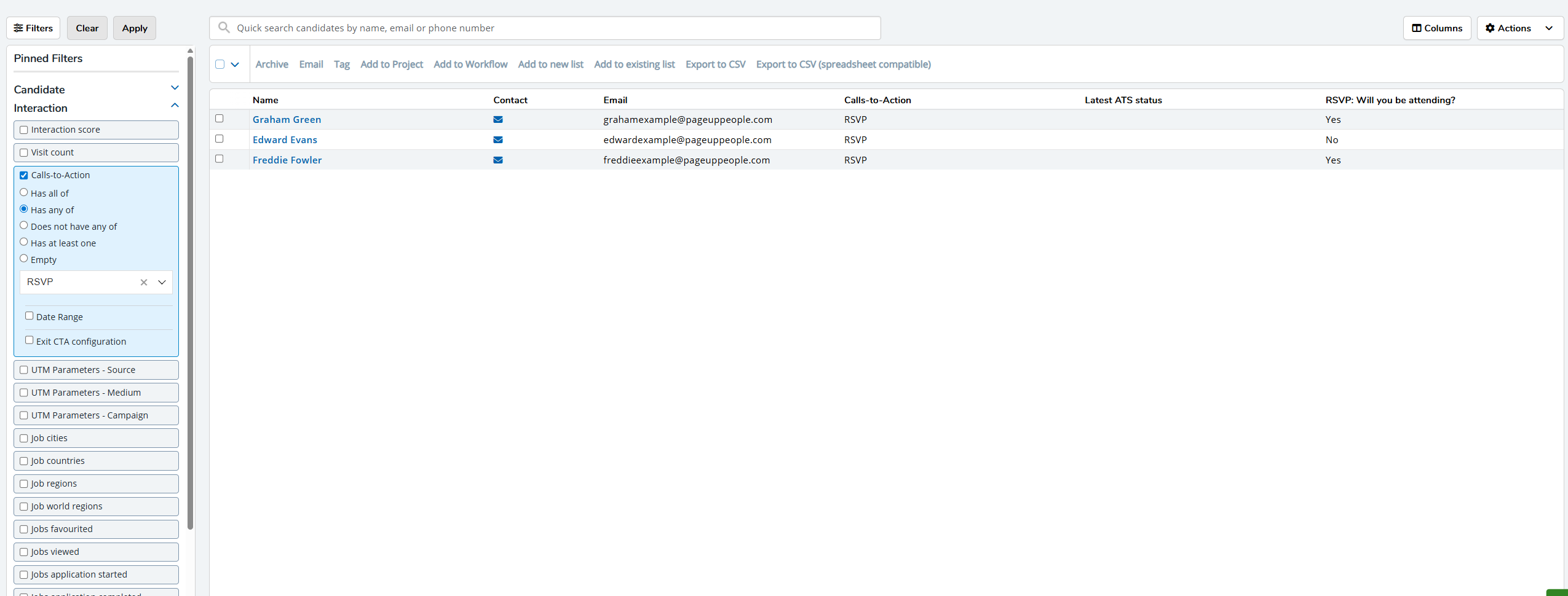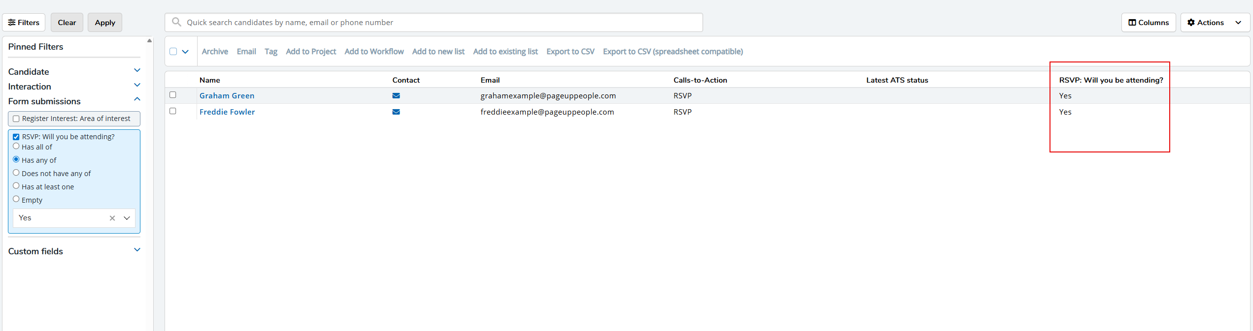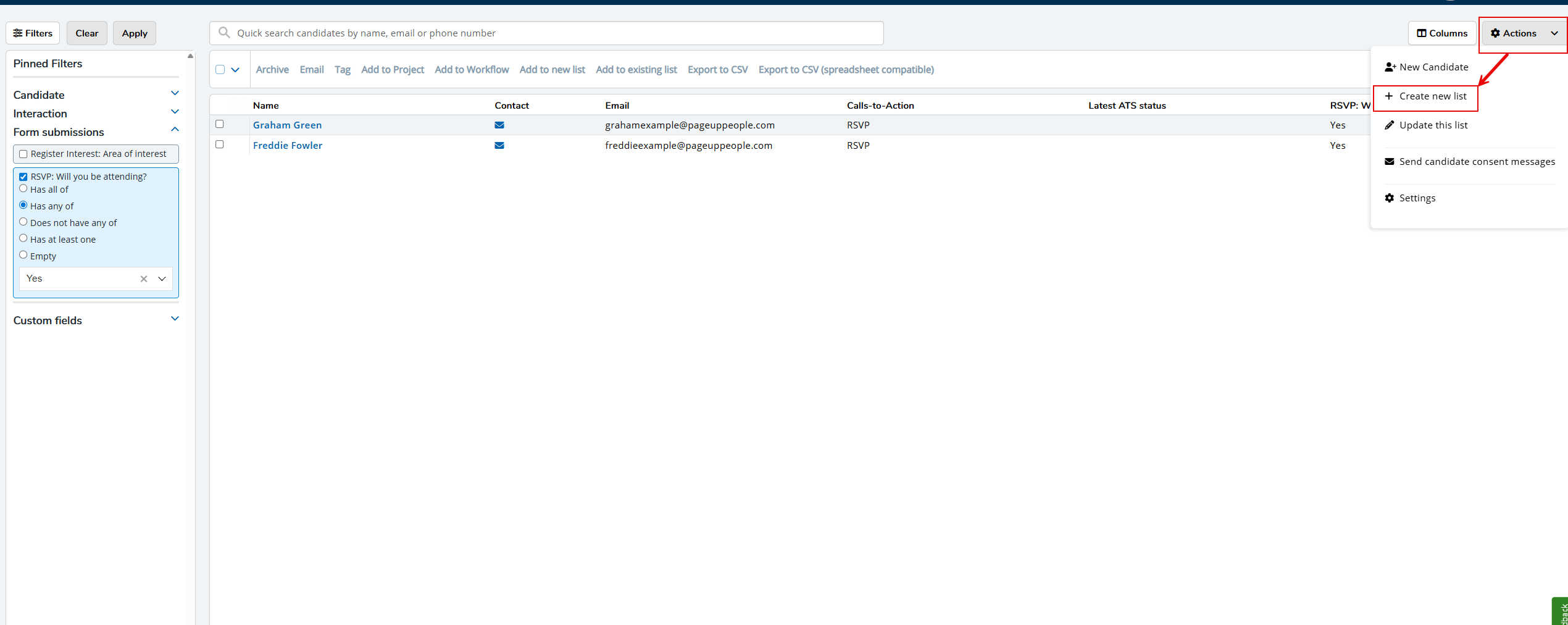 The grid view will update to include all those candidates who meet both sets of criteria specified, i.e., those from the original list who completed the initial RSVP CTA and now, also those who confirmed their intention to attend the event by selecting the Yes checkbox. - To create a smart list of those candidates, click the Actions button on the right.
