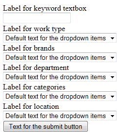 PU.Widgets.search("jobSearch", "http://careers.pageuppeople.com/517/", "caw", "en", {"selectText":"Select","submitButtonText":"Search","filterType":"dropdown","autoSearch":false,"filters":{"Keyword":"Keyword","WorkTypes":"Work type","Categories":"Category","Brands":"Brand","Departments":"Department","Locations":"Location"},"useListingWidget":"jobListing"});</script>The following fields are supported on a job mail alert widget: