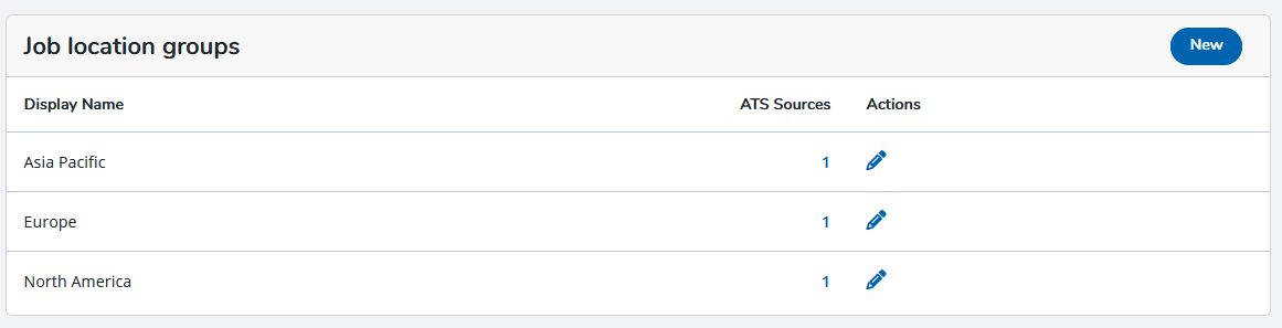 - On the Job location groups page, a list of job location groups will be displayed. Additionally, the number of ATS integrations attached to that particular location group will be shown in the ATS Sources column.