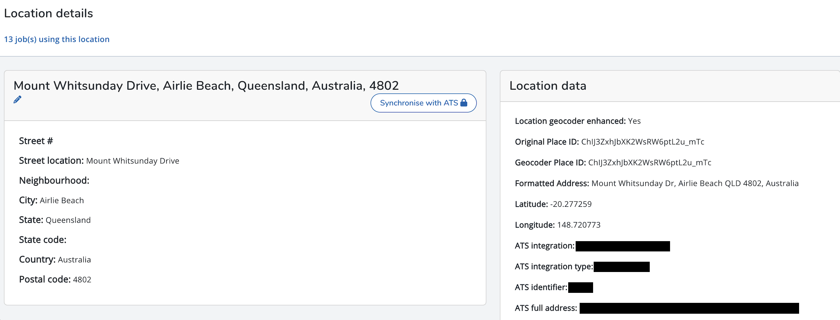 You can subsequently choose to opt this location back into receiving automatic updates by clicking the "Synchronise with ATS" button. This will lock the location record again, preventing direct edits within Recruitment Marketing.