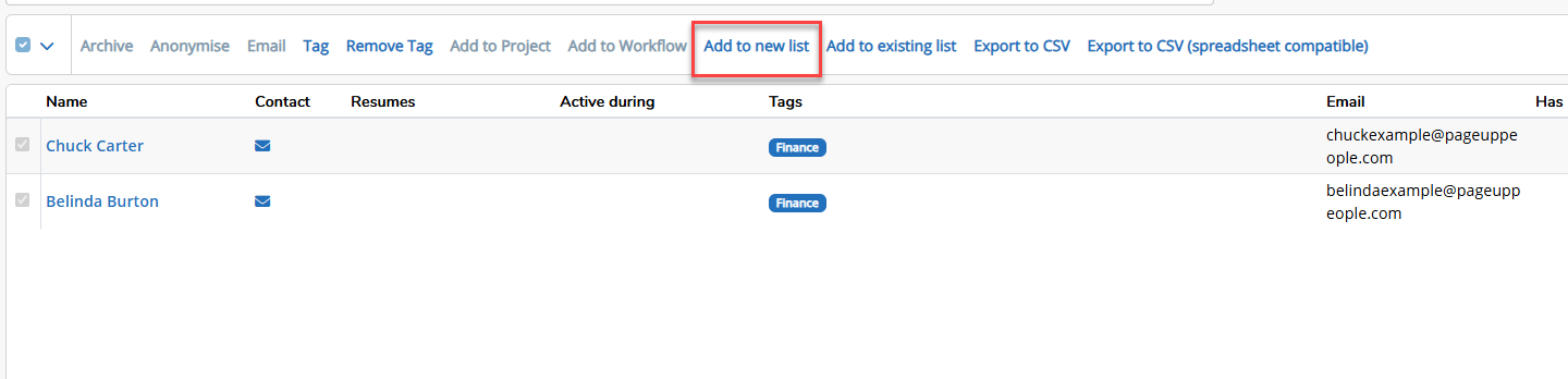 Candidates can also be added to an existing static list using the relevant option in the Actions bar, as shown above.
