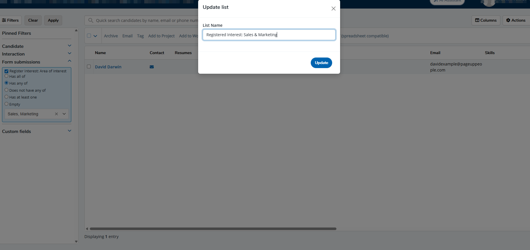 Now, with a view to reaching out to many more candidates through an email campaign, you wish to build out this list by adding in those who specified an interest in "Marketing" too.