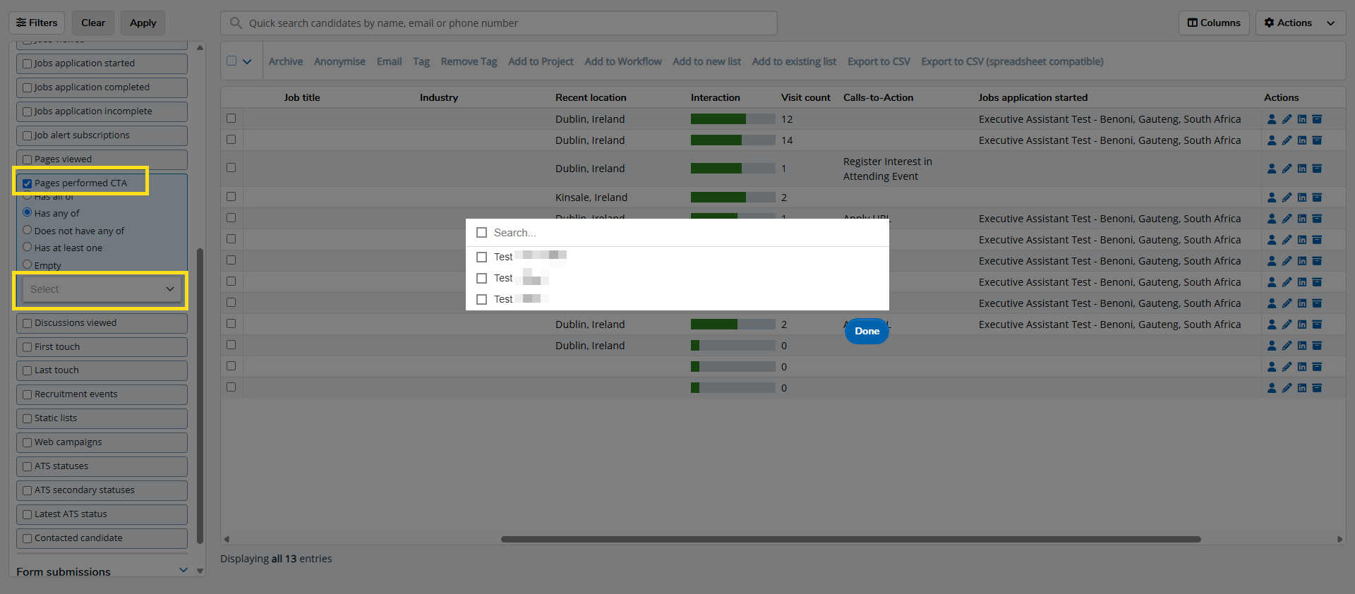 Whether in the days following a recruitment event, or once a content campaign has been running for some time, you will likely want to create a list of all those candidates who entered their details/filled out the form on a particular web page.