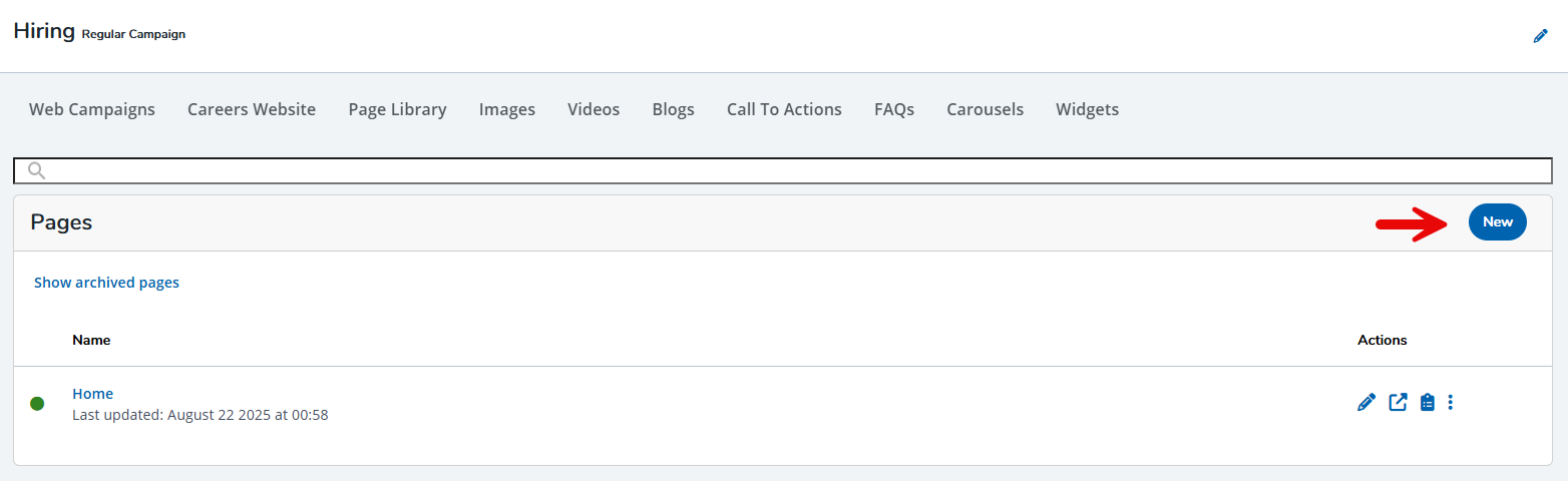As part of the implementation process, one or more pages will already be built for you when you first log in to the Recruitment Marketing module. All you need to do is edit the page content to suit your candidates' needs. You can do this by clicking on the Edit icon in line with the relevant page on the campaign screen.