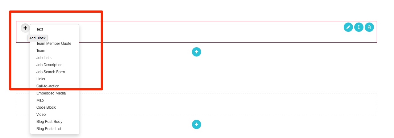 - Move your mouse over the individual columns in a row and click the Add Block button to choose a type of content block from the drop-down.