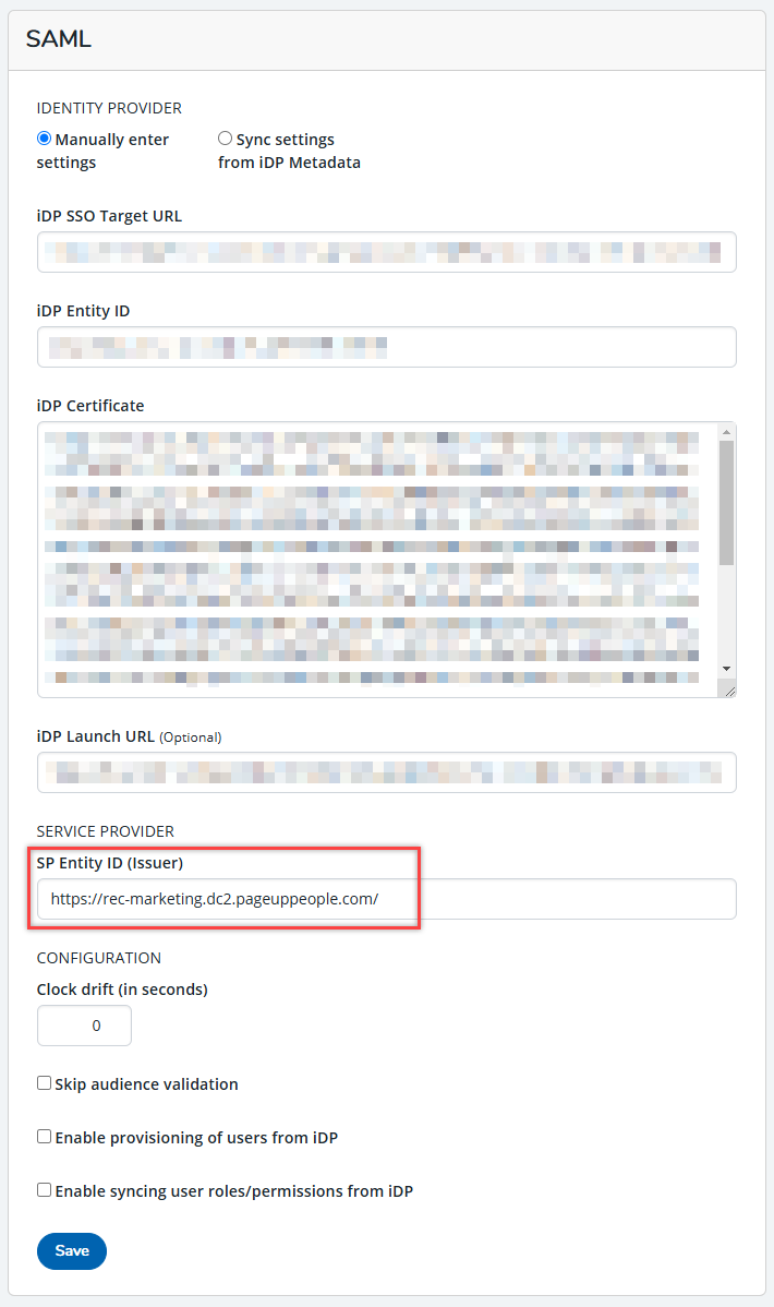 Enter the Identifier (Entity ID), ensuring it is the same as the SP Entity ID configured in Recruitment Marketing > Organisation > Settings under SAML.