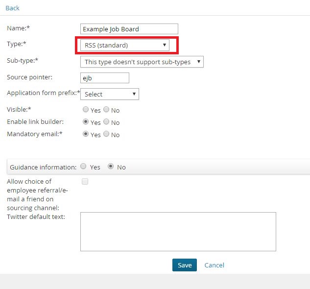 - Create a new RSS (standard) type sourcing channel, giving it the same name of the third party job board and a unique source pointer value.