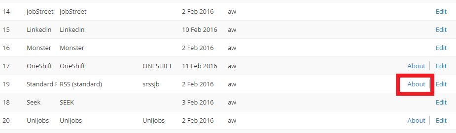 - The About page lists the RSS feed URLs that need to be provided to the third party job board to test/consume.