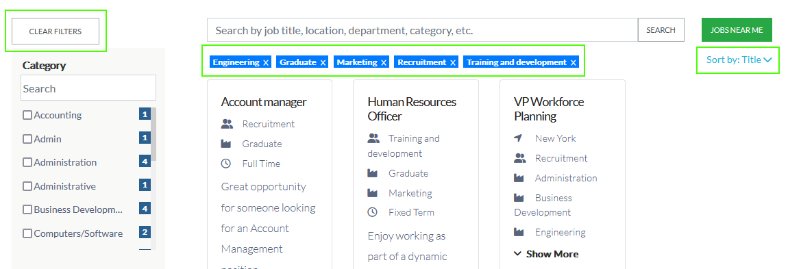 - Active filters indicator - when this option is enabled, the currently selected filters will be displayed to the candidate underneath the keyword search box.