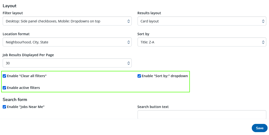 Refer to Configuring a job search results block for information on how to include these options.