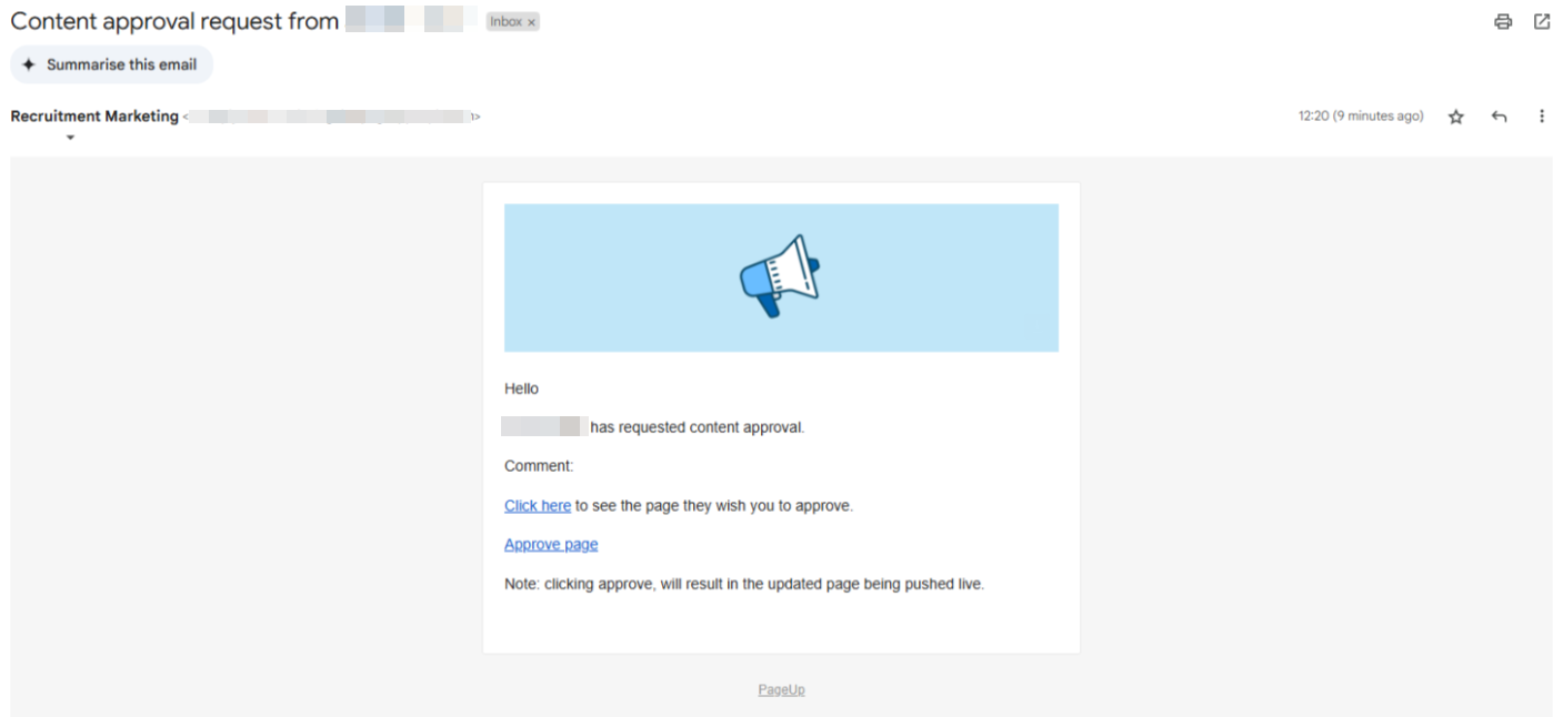 When clicking the Approve page link in the email, the user will be directed to a page to complete the approval.