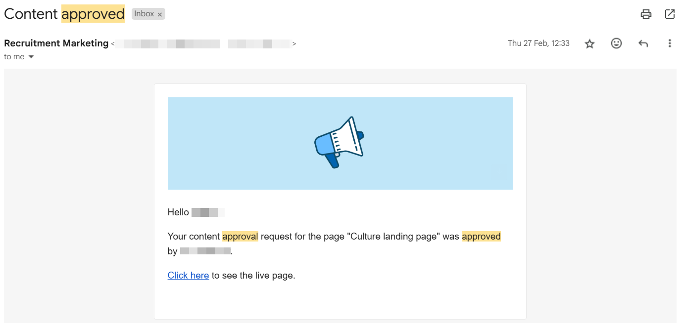 As a user with this role, you will get emails requesting content approval when a user without Content Publisher rights requests approval. This user may review and approve the content right from the email without needing to log in. This makes it a manager-friendly approval process.
