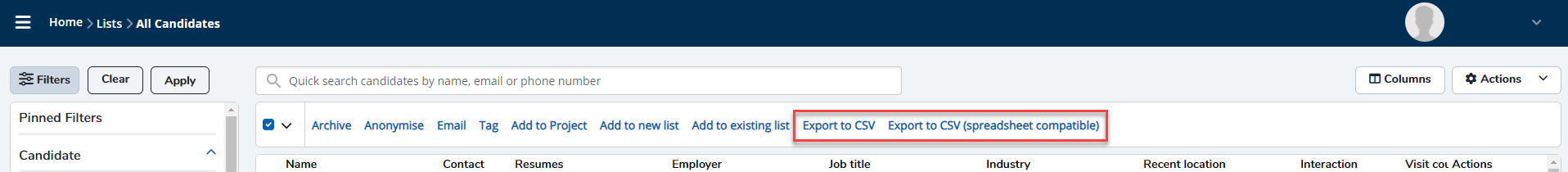 - Export All Candidates CSV (spreadsheet compatible)