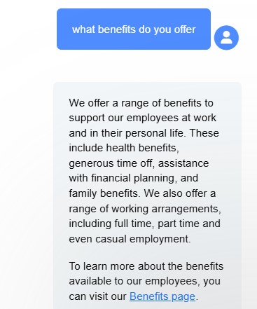 Casual job searching: Candidate usage across our Early Adopter customers has shown that not all candidates know the type of job they are searching for, but rather, they may be more interested in seeing all roles available in a certain location. We have improved the job search capability to allow for "not sure" like responses to be accepted when a candidate is asked the type of job they are looking for. The latest enhancement should help ensure that the chatbot showcases potential jobs the candidate may not think to search for.