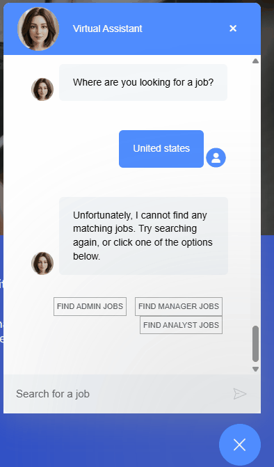 - If the location entered by the candidate is identified as a country, the chatbot will search for all jobs in that country, in combination with the relevant keywords.