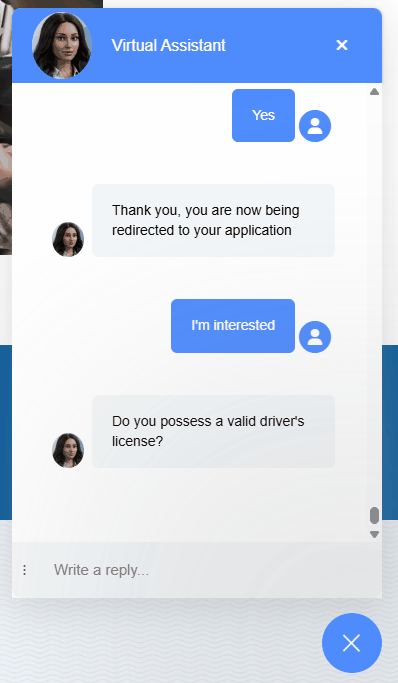 - Apply redirection: At the completion of an apply interaction in the chatbot, the candidate will be redirected to the ATS application process in a new browser tab.